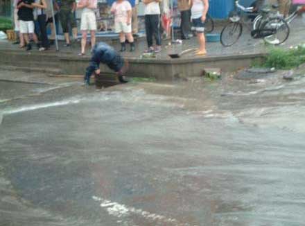 虎坊路一带已成河流,这真是坐车过河。排水系统怎么了?